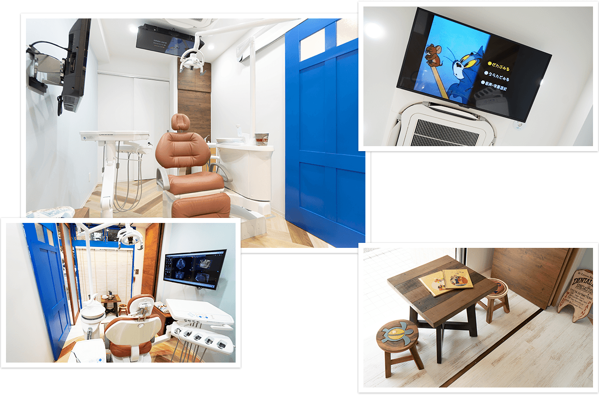 お子様連れも安心なファミリールームを完備しています。診療室内にお子様が遊ぶスペースがあり、治療の際は、ユニットを倒した状態でもアニメを見ることができる天井モニターを設置しています。